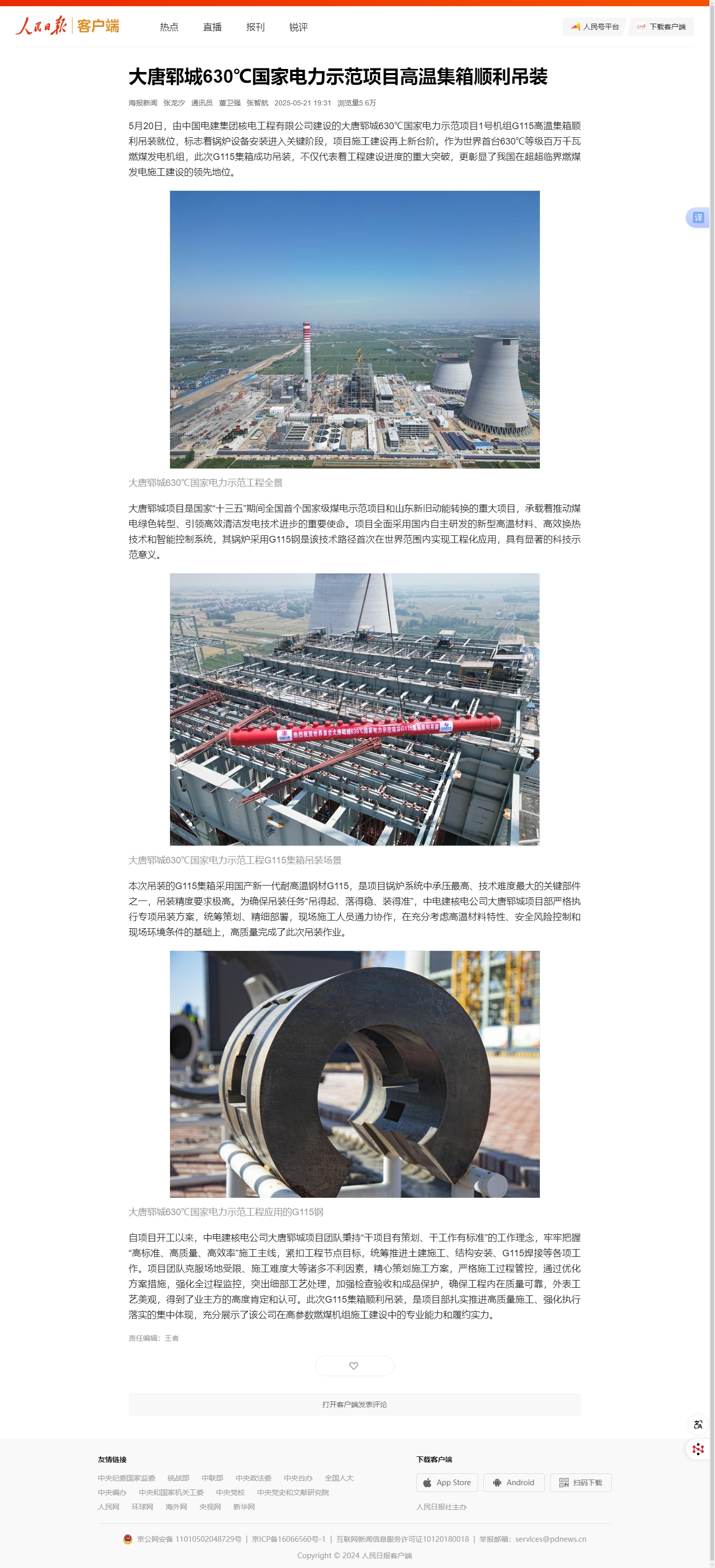 人民日报客户端:大唐郓城项目高温集箱顺利吊装